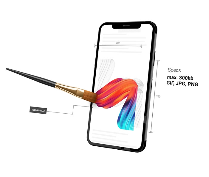 Selbst auf den kleinsten Bildschirmen entfaltet das Mobile Ricchi seine Werbewirkung. Es ist in den Content eingebettet und zieht sich beim Scrollen dank Parallax-Effekt über den ganzen Screen auf.